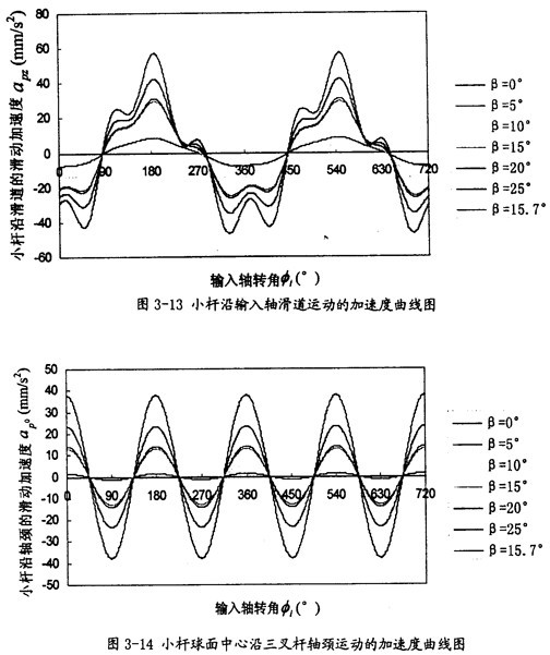 由曲線圖3-12可以看出,小桿球面中心P沿軸頸的線速度隨兩軸夾角β的增大其最大值增長也較快,它的變化頻率為一個回轉(zhuǎn)周期2次,曲線上下對稱這一數(shù)值可以作為動力分析中摩擦計算的重要依據(jù)。