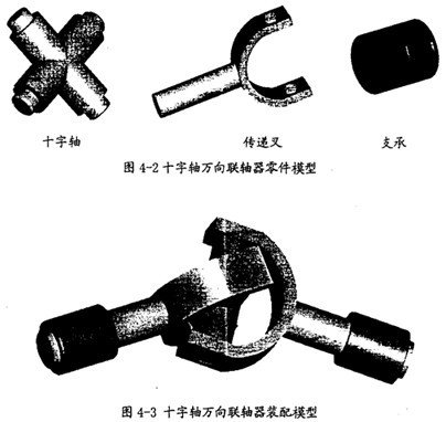 當(dāng)前,在工程領(lǐng)域,應(yīng)用美國PTC公司的CAD軟件Pro/E和美國MDI公司的動力學(xué)仿真軟件ADAMS聯(lián)合進(jìn)行復(fù)雜機(jī)械系統(tǒng)的動力學(xué)仿真研究是一種較實(shí)用、較流行的仿真方案。本文的仿真分析中所有模型均是采用這種方案。考慮到建模的注意因素,在用Pro/E建模的過程中,省去了十字軸萬向聯(lián)軸器的許多細(xì)小結(jié)構(gòu),如潤滑部分、滾針軸承、彈簧卡圈等,只是保留了十字軸萬向聯(lián)軸器在原理上進(jìn)行傳動的必需構(gòu)件和運(yùn)動副。在此原則下建立的十字軸萬向聯(lián)軸器的各構(gòu)件模型如圖4-2所示,實(shí)際上只包含十字軸和傳遞叉兩個活動構(gòu)件。建立的十字軸萬向聯(lián)軸器的裝配模型如圖4-3所示。