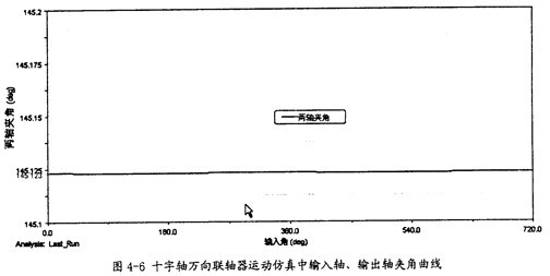選取合適的步長,在缺省模式下(由前面的自上度為0,可知此時的仿真是運(yùn)動仿真)對模型做仿真分析,并在結(jié)果中輸出兩軸夾角的測量值曲線圖(如圖4-6所示)以及輸入、輸出軸角速度測量的曲線圖(如圖4-7所示)。