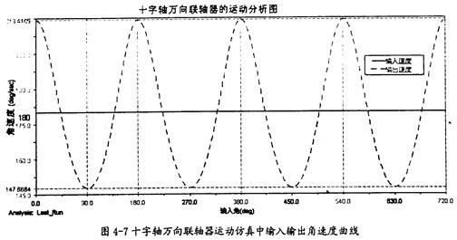 由圖4-9可以知道,當(dāng)輸入軸轉(zhuǎn)速恒定為90o/s時,輸出軸并不作恒速轉(zhuǎn)動,而是以90o/s為中心,作非常有規(guī)律的周期性運(yùn)動,在每一個回轉(zhuǎn)周期中,它的變化頻率為3次。這里的結(jié)果同第三章中的曲線圖3-8也是完全吻合的,因此在一定的程度上也證明了三叉桿萬向聯(lián)軸器轉(zhuǎn)速分析理論的正確性。
