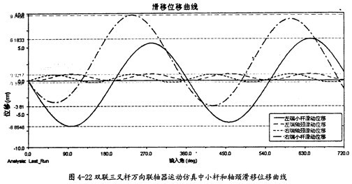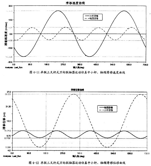 由圖4-12可以知道,在一定的夾角下,小桿在滑道中的滑移位移同小桿球面中心相對軸頸的滑移位移是不同的,前者(20.76mm)要遠(yuǎn)大于后者(2.93mm),且它們變動的頻率也不一樣,在一個回轉(zhuǎn)周期中,前者步率是1次,而后者2次。此圖中的兩曲線同第三章中的理論分析曲線圖3-9、圖3-10是吻合的。這在一定的程度上也證明了三叉桿式萬向聯(lián)軸器理論分析中對小桿滑移位移和軸頸滑移位移這兩項(xiàng)計算的正確性。