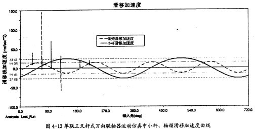 由圖4-11可以知道,在一定的夾角下,小桿在滑道中的滑移速度同小桿球面中心相對軸頸的滑移速度是不同的,前者要遠(yuǎn)大于后者,且它們變動的頻率也不一樣,在一個回轉(zhuǎn)周期中,前者頻率是1次,而后者是2次。此圖中的兩曲線同第三章中的理論分析曲線圖3-11、圖3-12是吻合的,只是小桿滑移的速度曲線在外形上有一點(diǎn)差異,仿真的曲線相當(dāng)?shù)钠交、?guī)則,但理論分析曲線卻不規(guī)則,這可能是在計算中簡化和省略的原因。盡管如此,這也證明了三叉桿式萬向聯(lián)軸器理論分析中對小桿滑移速度和軸頸滑移速度這兩項(xiàng)計算的正確性。