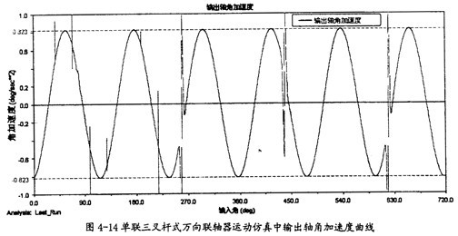 由圖4-6可知,仿真中十字軸萬向聯(lián)軸器的兩軸夾角實(shí)際上即是34.88°(原夾角的補(bǔ)角),在第二章的十字軸萬向聯(lián)軸器理論計算曲線圖中也包含了這個夾角下的運(yùn)動分析曲線(圖2-12),比較圖2-12中β=34.88°的曲線和圖4-7的曲線,可知兩條曲線在變化頻率、形狀、值的大小都是一樣的。