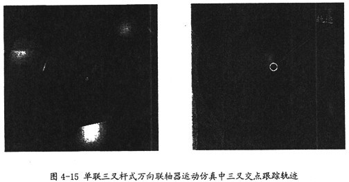 由圖4-15可以看出,在單聯(lián)三叉桿式萬向聯(lián)軸器的運(yùn)動仿真中,三叉交點(diǎn)運(yùn)動軌跡是一個圓,相對于半徑值R(此值的意義見第三章)它的半徑是相當(dāng)小的,這也解釋了為何運(yùn)動中兩軸夾角在不斷作微小的變化,同時也證明了軸頭中心軌跡理論的正確性。