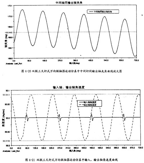 由圖4-20可以看出,中間桿同輸出軸間的夾角變化也呈現(xiàn)一定的規(guī)律,在每-個回轉(zhuǎn)周期中,它的變化頻率為3次。結(jié)合圖4-19、圖4-20可知中間桿同輸入軸及輸出軸夾角的變化頻率是不-樣的,這是雙聯(lián)三叉桿式萬向聯(lián)軸器有別于單聯(lián)三叉桿式萬向聯(lián)軸器的一種特性。