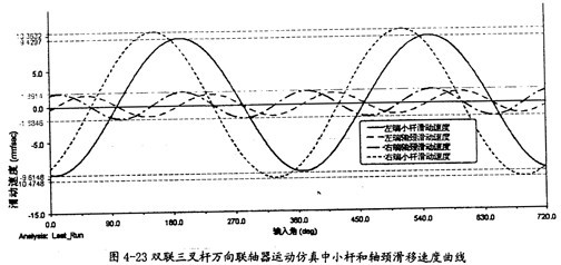 由圖4-23可以看出,雙聯(lián)三叉桿式萬向聯(lián)軸器在運(yùn)轉(zhuǎn)的過程中,左右兩端的小桿滑移速度幾乎相等,左右兩端軸頸的滑移速度也接近等值,且軸頸的滑移速度比小桿沿滑道滑移速度要小得多,它們的變化頻率同單聯(lián)時的情況相比也無變化,在大小上同β=10°的單聯(lián)三叉桿式萬向聯(lián)軸器的特性是相同的。