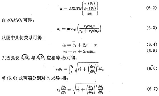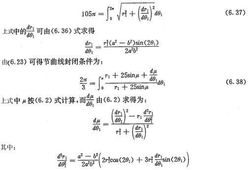 從以上設(shè)計(jì)過程可以看出,根據(jù)非圓太陽輪設(shè)計(jì)行星輪為圓的純滾動(dòng)非圓行經(jīng)齒輪傳動(dòng)機(jī)構(gòu)時(shí),并不是對(duì)任意指定的太陽輪節(jié)曲線都有解。當(dāng)太陽輪節(jié)曲線的周期數(shù)n1給定后,節(jié)曲線必須有兩個(gè)可調(diào)整的參數(shù)(例中的a和b)的要由節(jié)曲線的封閉條件及輪齒等分條件來確定。齒輪模數(shù)m和太陽輪齒數(shù)z1是被預(yù)先指定了的。當(dāng)各參數(shù)求出后,要用不干涉條件(6.28)式進(jìn)行校驗(yàn),若發(fā)生干涉,應(yīng)調(diào)整z1數(shù)值,重新計(jì)算太陽輪的可調(diào)整參數(shù)。