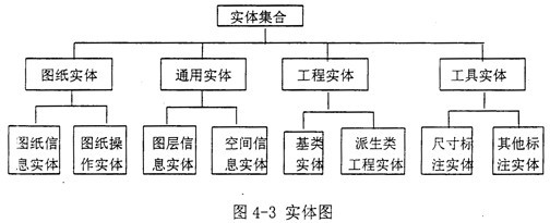 在面向?qū)ο蟮?SPAN lang=EN-US>CAD集成開發(fā)系統(tǒng)里,系統(tǒng)數(shù)據(jù)模型的基本元素就是ARX開發(fā)語言中的(多是C/C++語言)類,類實例化后稱為對象或?qū)嶓w,整個圖紙就是一個實體集合,主要由四大塊組成:圖紙實體集合、通用實體集合、工程實體集合和工程實體集合。其中,圖紙實體、通用實體和工具實體都為獨立類,沒有父類或子類;而工程實體集合中的各工程實體是由具有基本特征的基類實體派生而來,具有一個基類和若干個派生類,并且各實體集之間互相獨立(如圖4-3所示)
