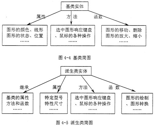 在上面所說的四種實體里,圖紙實體、通用實體、工具實體都是一些簡單實體,基本上是對一些AutoCAD的操作命令進行集成,使之能夠?qū)こ虒嶓w進行操作,并且符合不同行業(yè)的命名規(guī)則。而最復(fù)雜的是工程實體,首先,每個行業(yè)中工程實體的種類繁多,必須進行細致有序的分類,使之符合行業(yè)習(xí)慣;其次,確定基類與派生類之間的關(guān)系,有效地定義基類的各個屬性、方法和函數(shù),便于擴充派生類;最后,要完整的定義每一個工程實體的所有的屬性、方法和函數(shù),特別重要的是,要很好地利用AutoCAD已提供的所有信息資源。對于以上的問題,第一,要對行業(yè)的需求十分清晰,能夠?qū)π袠I(yè)中涉及到的工程實體進行歸納,要具有“面向?qū)ο蟆钡木幊趟季S;第二,基類涉及的屬性方法和函數(shù)基本上與實體圖形的操作有密切關(guān)系(如圖4-4所示);派生類主要涉及到工程實體的特征屬性、特征方法和特征函數(shù)(如圖4-5示),完整地定義其基類和派生類是“面向?qū)ο蟮?SPAN lang=EN-US>CAD集成開發(fā)系統(tǒng)”中的核心部分;第三,要充分的利用AutoCAD已提供的資源,主要就是要利用AutoCAD系統(tǒng)中的*,dwg文件的圖形文件數(shù)據(jù)庫中的資源,熟悉各種AutoCAD中實體(例如點、直線、圓弧等)的DXF碼規(guī)則,并從中提取相關(guān)特征信息;第四,由于在AutoCAD中的.dwg文件中,存儲的是一些簡單的幾何的點、直線、圓、弧等信息,故還需要另一個文件去記錄整個圖紙的工程實體圖形的邏輯關(guān)系(下一節(jié)詳細介紹),隨同*.dwg文件的打開而打開,標(biāo)識*.dwg文件圖形中的實體圖形邏輯關(guān)系,隨同*.dwg文件的關(guān)閉而記錄*.dwg文件中的實體圖菜邏輯關(guān)系。