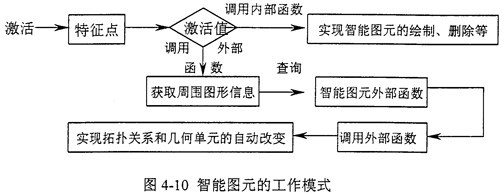 通過對特征點的激活,首先判斷激活值,是調(diào)用外部函數(shù)還是調(diào)用內(nèi)部函數(shù),如果是調(diào)用內(nèi)部函數(shù),則根據(jù)激活值,調(diào)用某個內(nèi)部函數(shù),實現(xiàn)智能圖元自身的操作,如刪除、放大、旋轉(zhuǎn)等等;如果是調(diào)用外部函數(shù),則再獲取周圍圖元信息,并以此查詢外部函數(shù)庫,得到某個外部函數(shù),則調(diào)用此外部函數(shù),實現(xiàn)智能圖元的拓撲關(guān)系和幾何單元信息的改變。(如圖4-11所示)