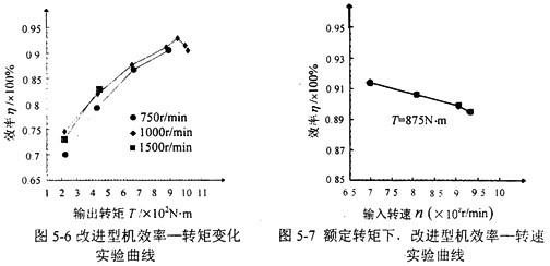在額定轉(zhuǎn)速和額定轉(zhuǎn)矩范圍內(nèi),改進(jìn)型機(jī)隨著輸出轉(zhuǎn)矩、輸入轉(zhuǎn)速的增加,均載機(jī)構(gòu)補(bǔ)償?shù)恼`差增大,均載效果更加明顯,所以改進(jìn)型機(jī)的傳動(dòng)效率隨輸入轉(zhuǎn)速的增加而增加。綜上所述,三環(huán)減速機(jī)的測(cè)得效率可達(dá)92%以上,因此本實(shí)驗(yàn)從減速機(jī)的傳動(dòng)性能上來講是成功的。