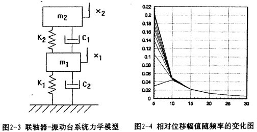 對應的力學模型如圖2-3(見22頁)所示,式中m1為振動臺動圈、聯(lián)軸器外套及固定在振動臺上夾具的質(zhì)量;m2為聯(lián)軸器內(nèi)套、芯軸及配重的質(zhì)量;K1為振動臺支撐動圈部分的剛度系數(shù),K2為聯(lián)軸器彈性元件的剛度系數(shù);C1為振動臺動圈阻尼系數(shù);C2為聯(lián)軸器