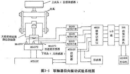 我們選用正弦激勵信號,頻率變化范圍選為l-30Hz,振幅變化范圍為±(l-8)毫米。試驗時,測量每一特定頻率、振幅下的加速度、速度、位移和力的振動信號,為了保證有足夠大的激勵力在不同頻率下使聯(lián)軸器達到穩(wěn)態(tài)周期大位移振動,選擇適當?shù)募钤O備至關(guān)重要。