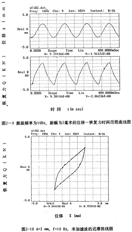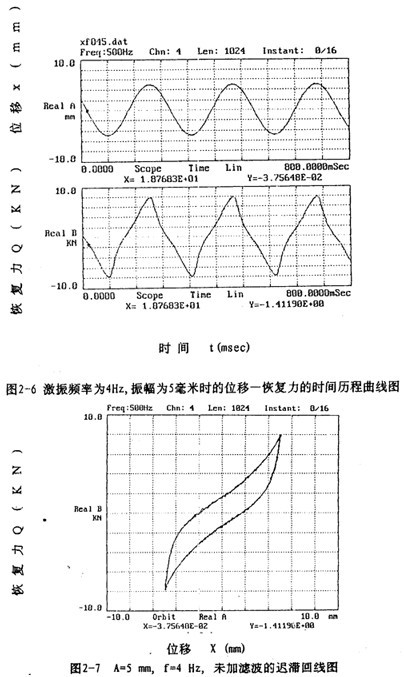 信號處理時,將磁帶記錄儀記錄的五路振動信號經(jīng)磁帶記錄儀回放,愉出到數(shù)據(jù)采集板(A/D板)進行五路振動信號(恢復力、位移、速度、加速度信號)同步采樣和A/D轉(zhuǎn)換,然后輸出到PC386微機存人磁盤,該數(shù)據(jù)采集系統(tǒng)采集的數(shù)據(jù)都是以二進制形式存儲的文件。為了計算和閱讀方便,需將二進制數(shù)據(jù)文件轉(zhuǎn)換成ASC碼文件,然后再編程進行數(shù)據(jù)處理.對處理后形成的數(shù)據(jù)文件進行作圖可以形成許多相應的曲線圖,圖2-6至圖2-13是眾多曲線中的一部分。