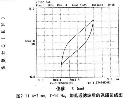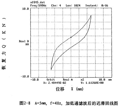 圖2-6表示激振頻率為4Hz,振動位移幅值為±5毫米的位移和恢復力的時間歷程曲線圖,由圖可知,位移時間歷程為正弦波形,對應的恢復力時間歷程為近似的鋸齒波形。以位移為橫坐標,恢復力為縱坐標,圖2-6對應的位移恢復力圖為圖2-7,由此圖可知彈性聯(lián)軸器具有非線性遲滯特性。在動態(tài)情況下,由于機座的高頻振動和環(huán)境干擾等因素,試驗記錄的信號中有高頻成分存在,這使得遲滯回線不光滑,加低通數(shù)字濾波后可得光滑的遲滯回線,如圖2-8所示。