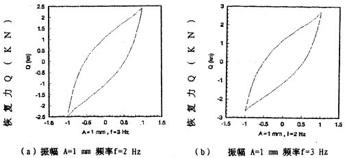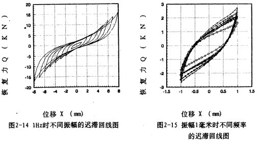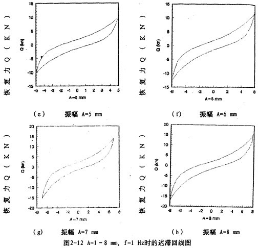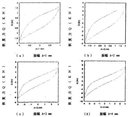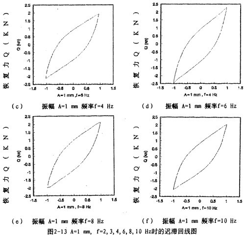 圖2-9(見26頁)表示激振頻率為1OHz,振動位移幅值為±2毫米的位移和恢復力時間歷程圖,圖2-10(見26頁)、圖2-11(見27頁)為對應的遲滯回線圖。圖2-l2(見27、28頁)表示激振頻率為IHz,振動位移幅值分別為±(1-8)毫米的位移一恢復力圖,圖2-14(見29頁)則為圖2-12的合圖,由圖2-14同頻率不同振幅的八條遲滯回線分析可知,大撓度剛絲繩彈性聯(lián)軸器的動剛度與振動幅值有關(guān),同時,從遲滯回線面積(表示聯(lián)軸器阻尼所耗散的能量)可知聯(lián)軸器的阻尼與振動幅值也有關(guān),即聯(lián)軸器的動剛度和阻尼均是振幅的非線性函數(shù)。