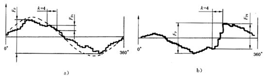 重要的事是記住,在濾掉長周期分量后,一齒切向綜合偏差fi′(圖33A)實際上變小了,這樣真正的最大偏差fi′就未必能在經(jīng)濾波后的短同期分量的曲線(圖33C)中表示出來。