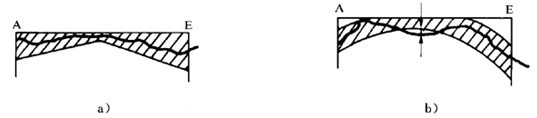 在線圖中,未修整齒面的螺旋線跡線是用一條直線來表示,而鼓形齒的齒面其相應(yīng)的跡線是弓形曲線,在線圖中,鼓形齒齒面的設(shè)計螺旋線和平均螺旋線變線通常是拋物線(見圖23)。