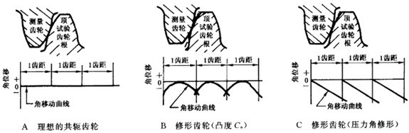 圖26所示意的是相當(dāng)于三種不同齒廓的產(chǎn)品齒輪與測量齒輪相嚙合產(chǎn)生的三個齒嚙合周期的切向綜合偏差記錄圖,第一個表示無修形也無誤差,第二個則表示自齒高中部開始到有效齒廓兩端逐漸修形,而第三個則表示有“傾斜偏差”。