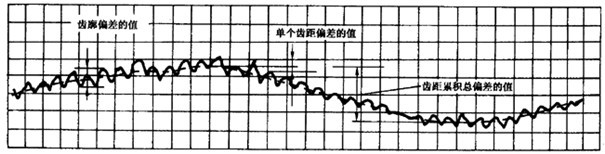 切向綜合偏差的記錄圖,包括齒輪和測量齒輪嚙合作完整圈旋轉(zhuǎn)數(shù)的長周期成分,和加在其上的各齒相繼嚙合的短周期成分。