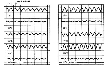 產(chǎn)品齒輪副嚙合所形成的切向綜合偏差線圖,通常顯示出一系列的周期性偏差,相應(yīng)于逐齒嚙合的循環(huán)以及小齒輪和大齒輪旋轉(zhuǎn)的周期。