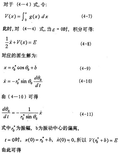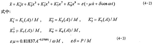 目前文獻(xiàn)上的一些方法對(duì)于弱非線性系統(tǒng)是有效的,而對(duì)于(4-2)式的強(qiáng)非線性系統(tǒng)則遇到了麻煩。由于描述非線性振動(dòng)系統(tǒng)的微分方程種類繁多,沒(méi)有普遍的解法,因此,仍然只有極少非線性振動(dòng)方程可求得精確解?尚械霓k法是針對(duì)不同非線性振動(dòng)方程的特點(diǎn)尋求一些近似數(shù)值解法。為研究方便,將(4-2)式進(jìn)一步寫成以下形式: