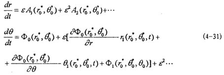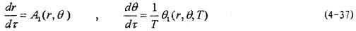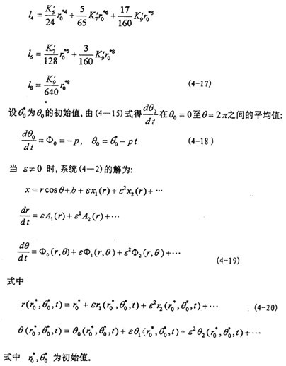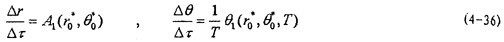 這就是對(duì)應(yīng)于(4-20式的頻閃差分方程,即(4-2)式在Poicare平面上以T為周期的點(diǎn)變換方程。如ε充分小,則可令△τ=dτ,△r=dr,△θ=dθ,此外,(4-36)中的