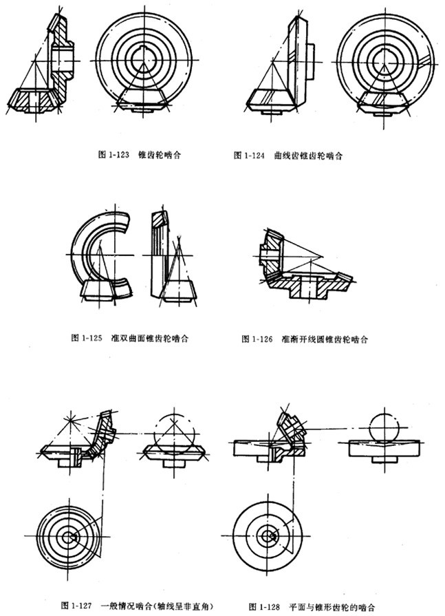 ③在圓柱齒輪嚙合、齒輪齒條嚙合和圓錐齒輪嚙合的剖視圖中,當(dāng)剖切平面通過兩嚙合齒輪的軸線時(shí),在嚙合區(qū)內(nèi),將一個齒輪的輪齒用粗實(shí)線繪制,另一個齒輪的輪齒被遮擋的部分用虛線繪制(圖1-119、1-1251、1-125、1-128);也可省略不畫(圖1-122、1-123、1-127)。