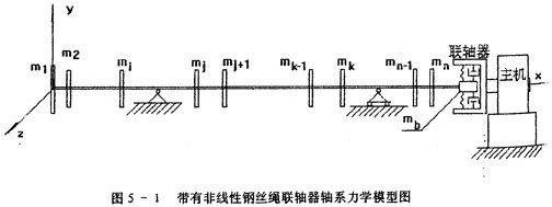 在第三章,根據(jù)試驗的基礎(chǔ)建立了具有非線性遲滯特性聯(lián)袖器的恢復(fù)力模型。這一章,將研究一個帶有這種聯(lián)軸器的軸系如圖5-1所示,該軸系有n個圓盤,由鋼絲繩聯(lián)軸器與主機(jī)相連接,按以下原則建立力學(xué)模型: