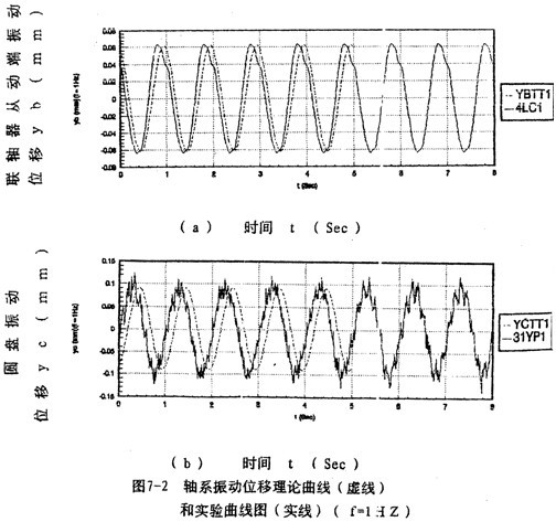 測量數(shù)據(jù)進行分析處理后,結(jié)果如圖7-2~圖7-5所示。圖7-2(a)~(b)和圖7-3(a)~(b)分別給出調(diào)速頻率為1。2赫茲時圓盤和聯(lián)軸器從動端y方向的振動位移時域曲線,圖7-4、圖7-5分別給出聯(lián)軸器從動端、圓盤y方向的振動位移的理論和實驗幅頻曲線圖(實線為理論曲線,圓點線為實驗曲線),總的來看,理論與實驗結(jié)果較好地重合。然而,在某些頻率點處,振運位移幅值的理論計算與實驗結(jié)果相差值,雖然絕對值差異并不大,但從相對值來講,差異較大,這是由于軸系還受到諸多因素,如軸承認、軸承、電動機等振動的相互影響;當然,測試儀器,數(shù)據(jù)處理都有可能產(chǎn)生誤差。由圖7-2、7-3還可以看到,理論計算與實驗所得的振動位移時域曲線之間存在著相位差,這是因為采集數(shù)據(jù)時,時域曲線的相位不能保證與理論計算相位一致造成的,但這不影響兩者的本質(zhì)特性。