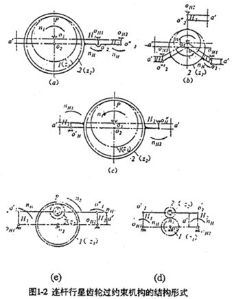 連桿行星齒輪傳動機(jī)構(gòu)還有如圖1-2所示的各種形式。圖1-1和圖1-2(a)、(b)、(d)、(e)均為平行四邊形機(jī)構(gòu),圖1-2(e)為反平行四邊形機(jī)構(gòu)。其中圖1-2(d)、(e)的連桿行星齒輪為外齒輪,其余均為內(nèi)齒輪。