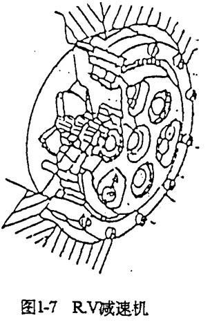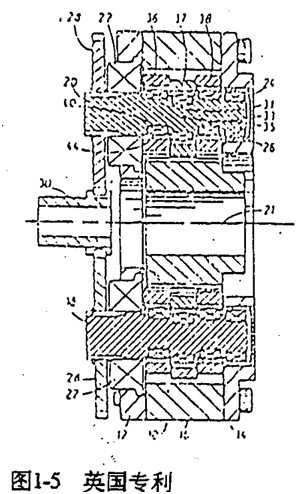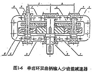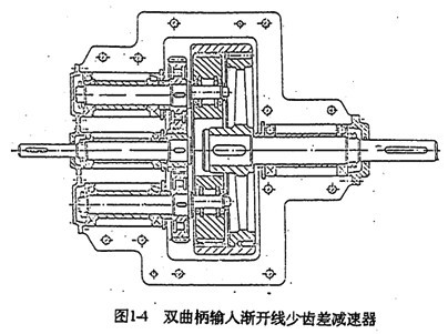 雙曲柄機(jī)構(gòu)中,如果在兩根曲軸上都有動力輸入,則“死點(diǎn)”位置也就自然不存在了。因此,可以通過一套定軸傳動機(jī)構(gòu)把動力從一輸入高速軸傳遞到另一高速軸,從而克服機(jī)構(gòu)“死點(diǎn)”。根據(jù)這種原理制成的雙曲柄輸入少齒差行星齒輪裝置之不理的類型很多,如太原工學(xué)院五十年代研制的雙曲柄輸入漸開線少齒差減速器(見圖1-4)、英國專利(見圖1-5)、、重慶鋼鐵公司研制的單齒環(huán)雙曲柄輸入少齒差減速器(見圖1-6)、日本松本和幸等人研制的RV減速器(見圖1-7)。其特點(diǎn)都是通過外嚙合齒輪副將輸入動力分流、傳遞到多個(gè)曲柄軸上,形式多軸輸入,從而克服“死點(diǎn)”。這種結(jié)構(gòu)的特點(diǎn)是其傳動比為定軸傳動的傳動比與少齒差行星齒輪傳動的傳動比之乘積,因而可以通過改變外嚙合齒輪的齒數(shù)方便函地滿足不同傳動比的要求,適應(yīng)性強(qiáng)。其不足之處是結(jié)構(gòu)復(fù)雜,而且在高速軸之間存在兩平行傳動的剛性傳動鏈(外齒輪嚙合副和雙曲柄機(jī)構(gòu))對誤差比較敏感,加工精度要求很高。