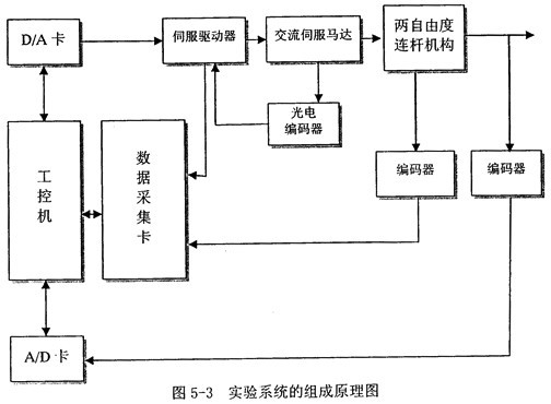 實驗方案以微機控制的交滾伺服電機為原動機之一與控制器、以兩自由度連桿機構(gòu)為實驗載體,輔以檢測系統(tǒng),建立了一個柔性速度補償裝置控制的實驗系統(tǒng)。