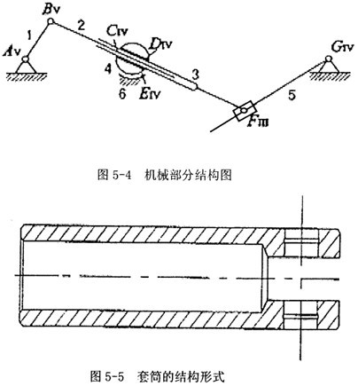 首先將原來的原理圖轉(zhuǎn)換成以下的機構(gòu)結(jié)構(gòu)圖(僅部分轉(zhuǎn)換),如圖5-4,即原來2、3構(gòu)件之間是滑塊和連桿連接,現(xiàn)改為連桿、套筒改為加一個擺動軸結(jié)構(gòu),原來滑塊3和地面連接,容易形成過約束,改為加一個擺動軸承4來和地面、套筒來連接。擺動軸承內(nèi)芯相當于一個球副,其轉(zhuǎn)動中心必為內(nèi)芯的球心,當然也是整個擺動軸承的中心。這樣便于加工查和實驗實施,而且更重要的是可防止原來原理圖中桿件連接出形成過約束。
