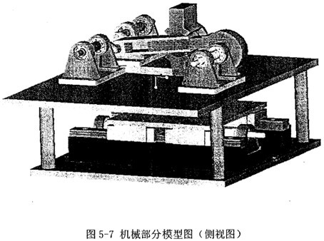 如圖5-1所示為實驗系統(tǒng)機械部分的模型圖片,為了顯示清楚,沒有配置外邊的機箱,整個機構(gòu)是完全開放式的,這樣也便于實驗觀察。該機械結(jié)構(gòu)由上下兩個機架支撐,和前面的原理圖不同,下邊機架上放置昆旋導(dǎo)軌構(gòu)件(未顯示伺服電機),上邊機架則是上圖所示的其余連桿機構(gòu)及其支撐架、軸承等(未顯示常速電機)。