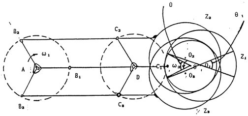 如圖7-1示,三環(huán)減速器三套平面四桿機(jī)構(gòu)AB1C1D-01、AB2C2D2-02、AB3C3O3及外齒輪見(jiàn)圖中所示。在圖示位置時(shí),平面四桿機(jī)構(gòu)AB1C1D處理死點(diǎn)位置,運(yùn)動(dòng)處于不確定運(yùn)動(dòng)狀態(tài),由于嚙合力的作用將產(chǎn)和瞬間的沖擊力。為了能除去或減少該沖擊力的作用,我們?cè)谝欢ǖ慕嵌圈葍?nèi)對(duì)AB1C1D上的內(nèi)齒輪進(jìn)行修形,使在死點(diǎn)位置時(shí),平面四桿機(jī)構(gòu)AB1C1D不受嚙合力或少受嚙合力作用,這樣,通過(guò)其余兩套平面四桿機(jī)構(gòu)就能較易將其速成過(guò)死點(diǎn)位置,從而達(dá)到減不止或消除過(guò)死點(diǎn)的沖擊。同樣,對(duì)另兩套平面四桿機(jī)構(gòu)AB2C2D2及AB3C3O3作同樣的修形。這種方法我們已正在試驗(yàn)過(guò)程中。