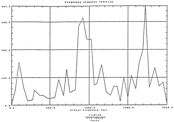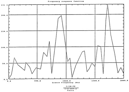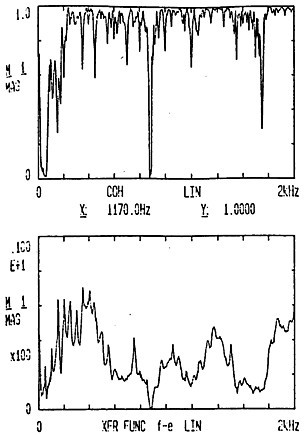 有了脈沖激勵信號和脈沖響應(yīng)信號后,CF-355頻譜分析儀就能計(jì)算出測點(diǎn)12X向由于14點(diǎn)X向激勵間的頻響函數(shù)H(ω)及其相干函數(shù),如圖4-5所示。圖4-6是頻響函數(shù)H(ω)的倒數(shù)。