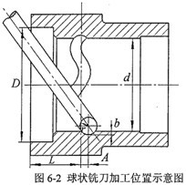 由于圓柱正弦活齒減速器徑向尺寸小,在現(xiàn)有國產(chǎn)銑刀的條件下,加工殼體的內(nèi)空間正弦滾道具有很大的難度,本文提出一種加工方案,較好的解決了這個難題。采用五坐標(biāo)數(shù)控加工中心,將球狀銑刀傾斜一定角度,斜插進(jìn)殼體內(nèi)圓柱面進(jìn)行銑削加工,其加工位置示意圖如圖6-2。