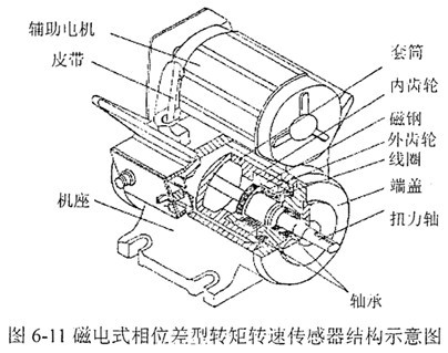 圖6-11為磁電式相位差型轉(zhuǎn)矩轉(zhuǎn)速傳感器的結(jié)構(gòu)示意圖,它由機(jī)座、端蓋、扭力軸、內(nèi)齒輪、外齒輪、磁鋼、線圈軸承等組成。內(nèi)齒輪、磁鋼固定在套筒上,線圈固定在端蓋上,外齒輪固定在扭力軸上,當(dāng)內(nèi)外齒輪發(fā)生相對轉(zhuǎn)動時,由于磁通不斷變化,在線圈中便感應(yīng)出近似正弦波的感應(yīng)電勢ul、u2,兩感應(yīng)電勢的初始相位差是恒定的,考慮到正反加載, 設(shè)計在大約180°位置上,當(dāng)加上扭力時,扭力軸發(fā)生扭轉(zhuǎn)變形,在彈性范圍內(nèi)外加扭矩與機(jī)械扭轉(zhuǎn)角成正比,這時ul、u2訊號的相位差要發(fā)生變化,即