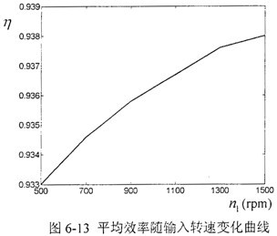 同樣方式測得當(dāng)輸入轉(zhuǎn)速分別為700rpm、900 rpm、1100 rpm、1300 rpm、1500 rpm時,減速呂樣機(jī)的平均效率隨輸入轉(zhuǎn)速變化曲線如圖6-13。通過測試結(jié)果表明,在低中速情況下,減速器的傳動效率受其轉(zhuǎn)速的影響不明顯,由于此時潤滑脂溫度較低,隨著轉(zhuǎn)速的增加,減速器的傳動效率略有提高,其平均值在93%以上,由引說明本文設(shè)計的減速器具有較高的傳動效率。