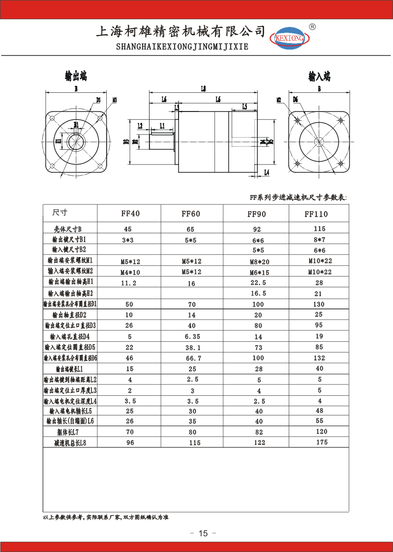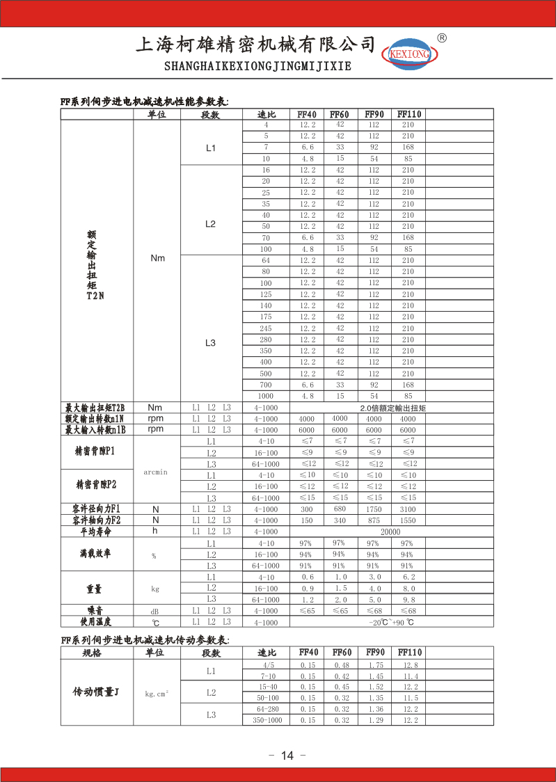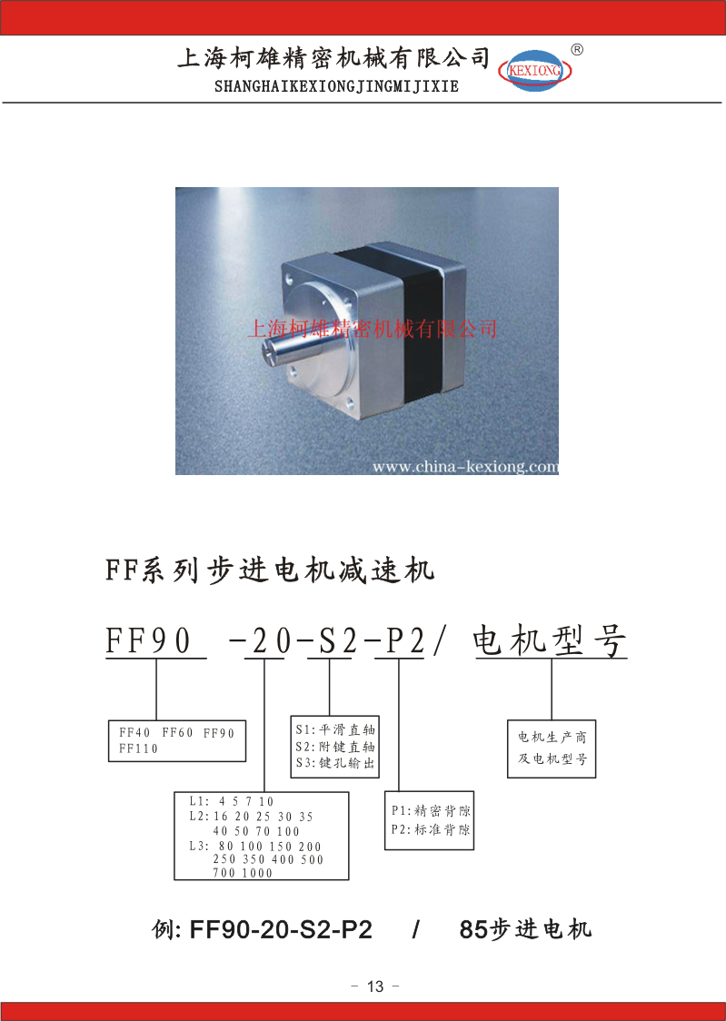 FF系列步進(jìn)電機(jī)減速機(jī):FF40、FF60、FF90、FF110、同軸式機(jī)座型號(hào),速比:3-1000有20多個(gè)比速可選擇;分一、二、三級(jí)減速傳動(dòng);精度:一級(jí)傳動(dòng)精度在8-10弧分,二級(jí)傳動(dòng)精度在6-8弧分,三級(jí)傳動(dòng)精度7-10弧分;等一千多種規(guī)格。