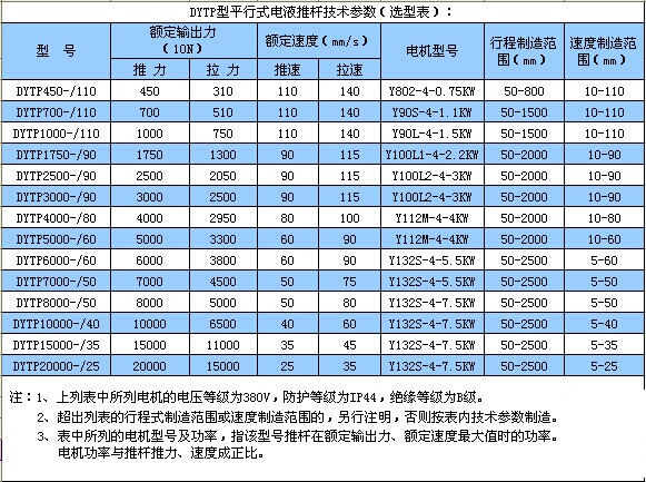 電液推桿主要是由推桿的型式、電機(jī)的防護(hù)等級(jí)、額定輸出力、行程、額定速度和使用角度等六大基本要素組成,還可根據(jù)擁護(hù)特殊要求,配套三種調(diào)節(jié)功能,即:速度調(diào)節(jié)推、拉力調(diào)節(jié),行程調(diào)節(jié)(行程開(kāi)關(guān)定位)。除上述三種調(diào)節(jié)功能定貨時(shí)必須文字注明外,其他請(qǐng)參照型號(hào)編制方式,認(rèn)真填寫六大要素。 DYTP型平行式電液推桿技術(shù)參數(shù)(選型表)