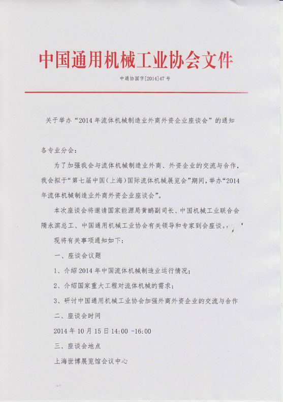 為了加強(qiáng)我會與流體機(jī)械制造業(yè)外商、外資企業(yè)的交流與合作,我會擬于“第七屆中國(上海)國際流體機(jī)械展覽會”期間,舉辦“2014年流體機(jī)械制造業(yè)外商外資企業(yè)座談會”。