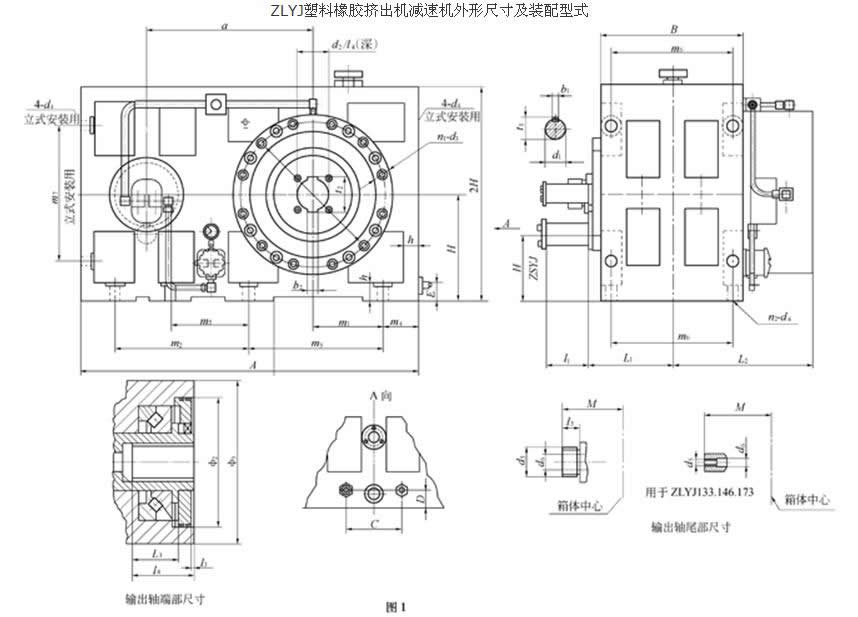 適用條件 1、減速機(jī)高速軸轉(zhuǎn)速不大于1500r/min。 2、齒輪傳動(dòng)圓周速度不大于20m/s。 3、工作環(huán)境溫度為-40~+45℃。如果低于0℃,啟動(dòng)前潤滑油應(yīng)預(yù)熱至0℃以上,當(dāng)溫度超出規(guī)定時(shí),可按用戶要求,另行配置潤滑加熱或冷卻裝置。本減速機(jī)可用于正反兩個(gè)方向運(yùn)轉(zhuǎn),但部分機(jī)型高速軸帶單向油泵,默認(rèn)方向?yàn)椋好鎸?duì)輸出軸,輸出軸為順時(shí)針旋轉(zhuǎn)。如方向改變,請(qǐng)?jiān)谟嗀洉r(shí)說明。 本機(jī)廣泛應(yīng)用在單螺桿擠出機(jī):塑料管材、板材機(jī)組、吹膜機(jī)組、造顆粒機(jī)組、電纜機(jī)組、注塑機(jī)組等。橡膠擠出機(jī)。以及食品擠出機(jī)械。 花鍵、方孔、六方孔以及出軸頭的方頭、圓頭等(需要訂做)規(guī)格φ2(H7) l3 φ3 d4 n2 m1 m2 m3 m4 m5 m6 m7 C D E d5 d6 l5 M ZLYJ112 160 8 210 14 4 96 326 50 136 170 M16 18 125 ZLYJ133 180 8 230 16 6 104 185 185 61 180 184 M18 20 137 ZLYJ146 200 8 260 16 6 118 190 235 72 210 210 85 38 ZG1/2″ M18 20 167 ZLYJ173 230 8 300 18 6 113.5 220 220 68 225 214 m20 25 167 ZLYJ200 270 8 350 18 6 150 275 275 100 290 310 120 40 m85*4 40 50 250 ZLYJ225 330 8 420 26 6 165 310 310 90 315 330 140 50 55 265 ZLYJ250 330 8 420 26 6 205 360 360 105 330 340 160 50 285 ZLYJ280 360 8 450 30 6 200 385 385 100 355 380 160 50 300 ZLYJ315 365 8 450 30 6 260 450 450