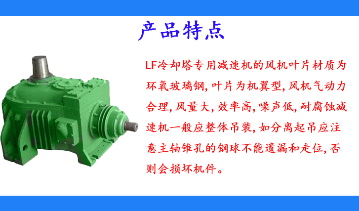 LF臥式冷卻塔專用減速機(jī)安裝形式為水平臥式,該減速機(jī)噪聲低,效率高,性能好,油潤(rùn)滑可靠,檢修方便,亦有油溫,震動(dòng)報(bào)警裝置。