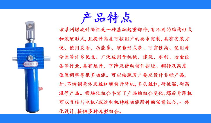 該系列螺旋升降機(jī)是一種基礎(chǔ)起重部件,有不同的結(jié)構(gòu)形式和裝配形式,且提升高度可按用戶的要求定制,具有安裝方便、使用靈活、功能多、配套形式多、可靠性高、使用壽命長等許多優(yōu)點(diǎn)。廣泛應(yīng)用于機(jī)械、建筑、水利、冶金設(shè)備等行業(yè),具有起升、下降及借助輔件推進(jìn)、翻轉(zhuǎn)及高度位置調(diào)整等很多功能?梢园凑湛蛻粢笤O(shè)計(jì)非標(biāo)產(chǎn)品,如:不銹鋼殼體及絲杠螺旋升降機(jī),多頭絲杠,耐低溫,耐高溫等產(chǎn)品。模塊化組合豐富了產(chǎn)品的組合變化,螺旋升降機(jī)可以直接與電機(jī)/減速電機(jī)特殊功能附件的任意組合,一體化設(shè)計(jì),提供多種選型組合