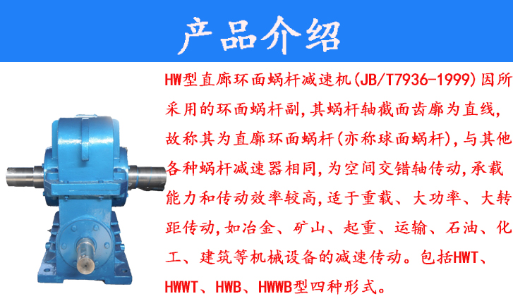 HW型直廊環(huán)面蝸桿減速機(JB/T7936-1999)因所采用的環(huán)面蝸桿副,其蝸桿軸截面齒廓為直線,故稱其為直廓環(huán)面蝸桿(亦稱球面蝸桿),與其他各種蝸桿減速器相同,為空間交錯軸傳動,承載能力和傳動效率較高,適用于重載、大功率、大轉距傳動,如冶金、礦山、起重、運輸、石油、化工、建筑等機械設備的減速傳動。包括HWT、HWWT、HWB、HWWB型四種形式。