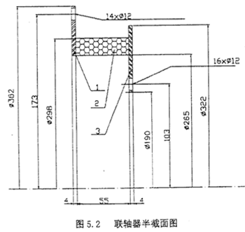 根據(jù)實(shí)際情況觀察可知橡膠塊左右分別有兩塊鋼板,析上均有一些圓孔,通過(guò)實(shí)際測(cè)量得到聯(lián)軸器的基本尺寸和形狀。由于聯(lián)軸器為軸對(duì)稱圖形,故只畫(huà)出其截面圖(圖5.2)。