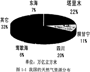 我國天然氣總資源量為3.8×1013m3。其中在面積為560,000km2的塔里木盆地,天然氣資源量就達8.39×l012m3。其中累計已探明地質儲量4.19×l011m3,剩余可采儲量2.79×l011m3,是國內天然氣資源量及剩余可采儲量最豐富的氣區(qū)。預計今后五至十年,累計探明地質儲量可達1×1012m3。此外,從圖1-1可以看到,陜西、四川、青海等地的天然氣儲量也都十分可觀,氣田分布的西傾狀況比較明顯。
