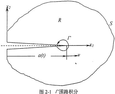對(duì)含運(yùn)動(dòng)裂紋的一般彈性體,為確定釋放到裂尖的能量,考慮圍繞裂尖非常小的閉合回路Γ,如圖2-1所示,動(dòng)態(tài)能量釋放率可以由能量流動(dòng)定義為: